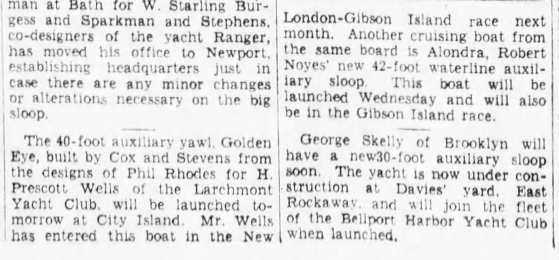 H Prescott Wells Golden Eye launch - Brooklyn Daily Eagle 21 May 1937.jpg