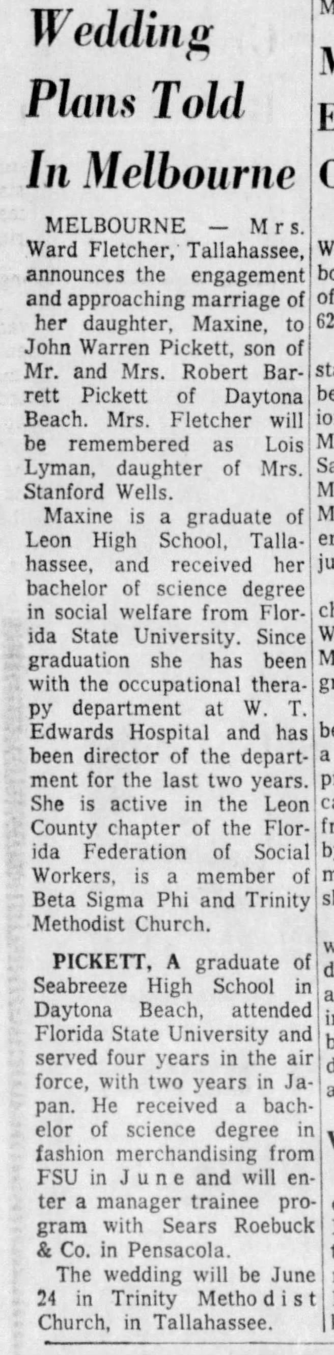 Marriage announcement Maxine Fletcher - Orlando Sentinel 18 Jun 1961.jpg
