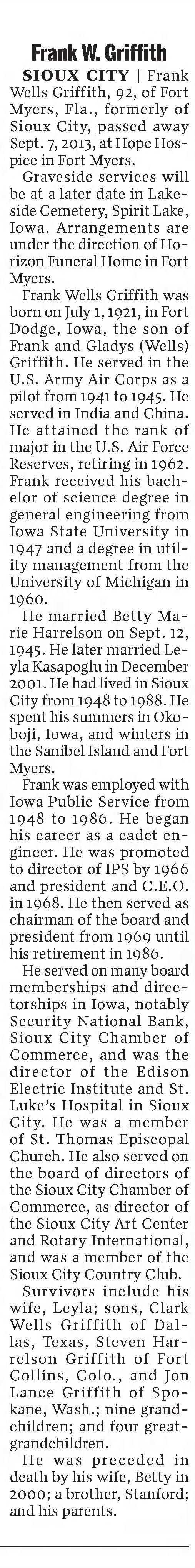 obit Frank Wells Griffith Sioux City Journal 12 Sep 2013.jpg
