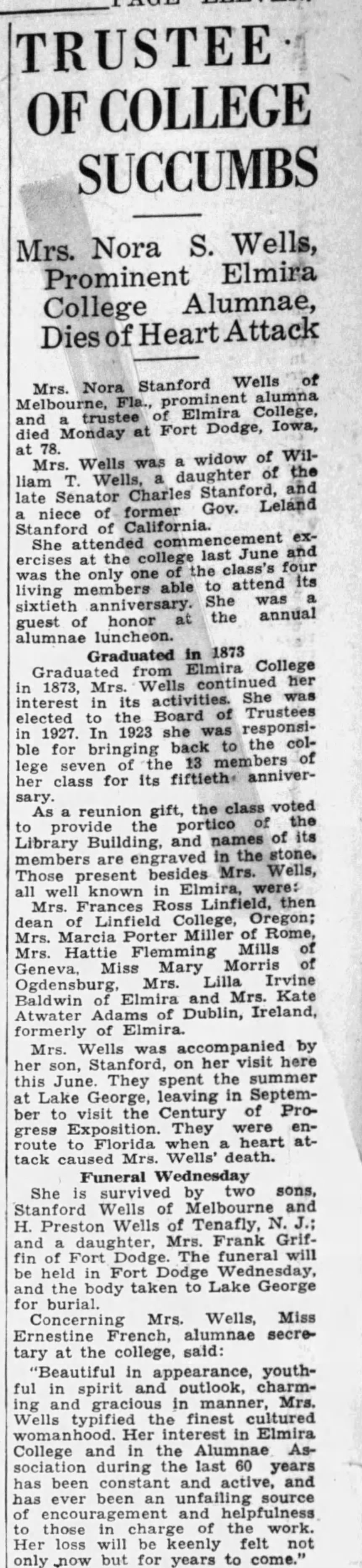 obit Nora Stanford Wells Star-Gazette(Elmira NY) 3 Oct 1933.jpg